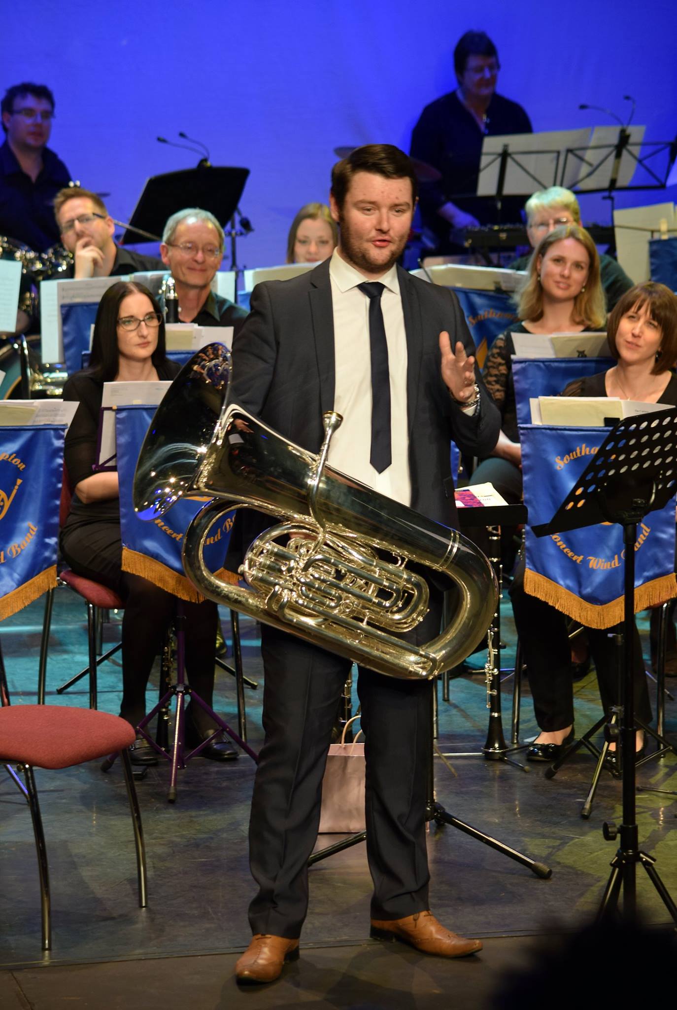 For me the highlight of the concert was Chris' performance of 'Excursions' by Bruce Broughton. This ever-changing, fast, syncopated and fragmented piece was extremely demanding. It exceeds the normal boundaries both musically and technically. Chris opened the piece with the recurring theme before it travelled throughout the band. The piece is pulled in all directions and wandered through multiple time signatures during its six and half minutes. The trumpet line is tough, as is the accompaniment; technically stretching the players, relentless, with no room to hide. Most soloists would find it an achievement just to get to the end without stopping, but Chris accomplished this with technical excellence, keeping complete control of his tremendous tone quality.