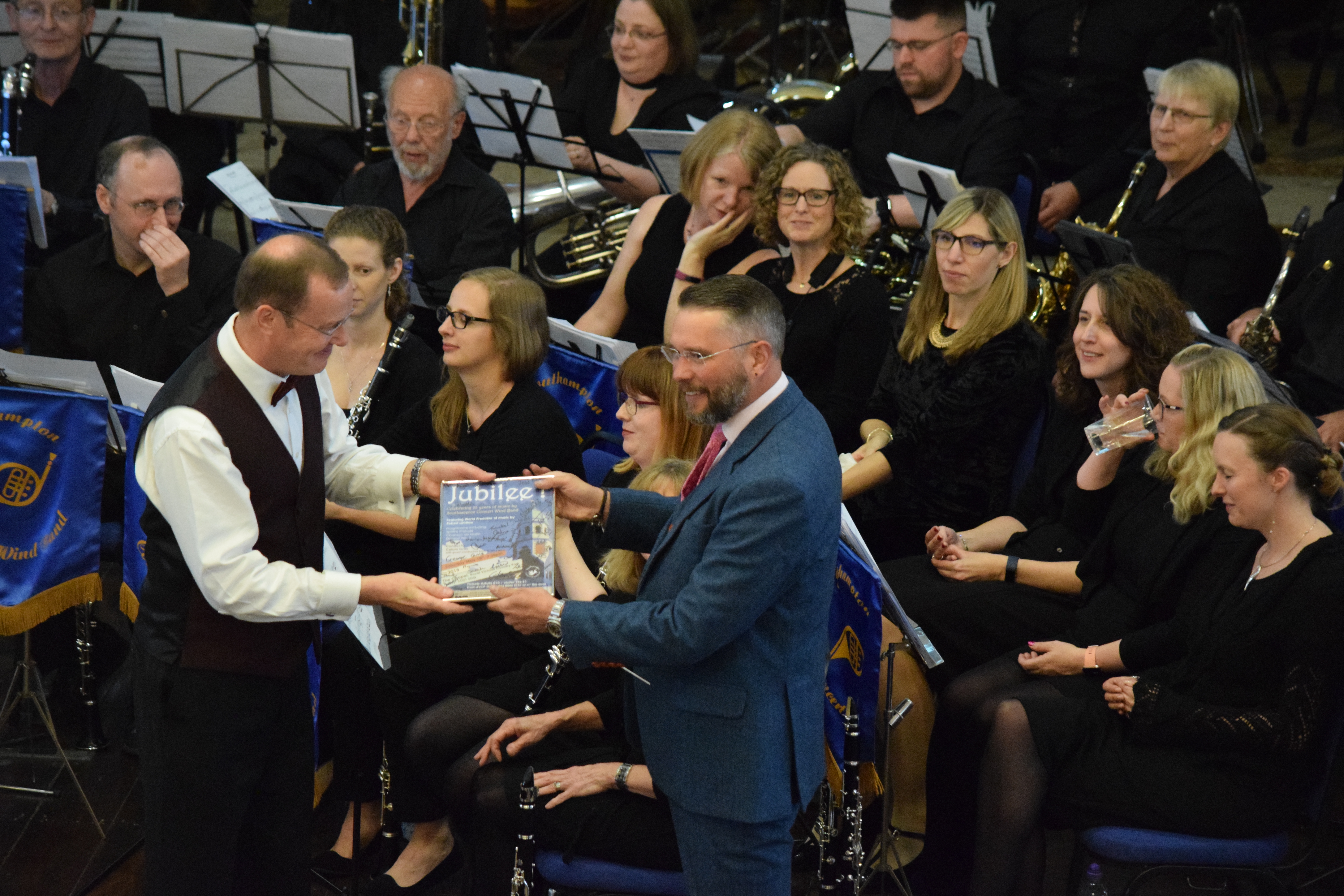 From my own viewpoint, I believe that the two bands worked really well together and the choice of programme gave the audience the chance to compare contrasting repertoire and genres from each ensemble when playing separately and together. Many of us had the chance to chat to our opposite numbers in the other band, and in the photos I took it is interesting to see this going on. Of course for Dawn (wife, and bassoonist) and me, we had our feet in both camps, and on the night found that there was no rest – for the wicked? We also had to include a costume change!/p>